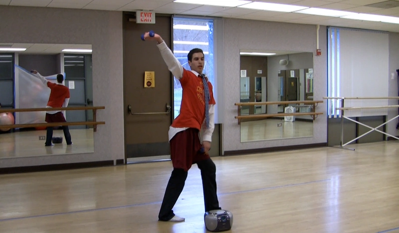Filipe gay-walks into the fitness room, holding a boom box. He sets it down, reaches up and stretches down.