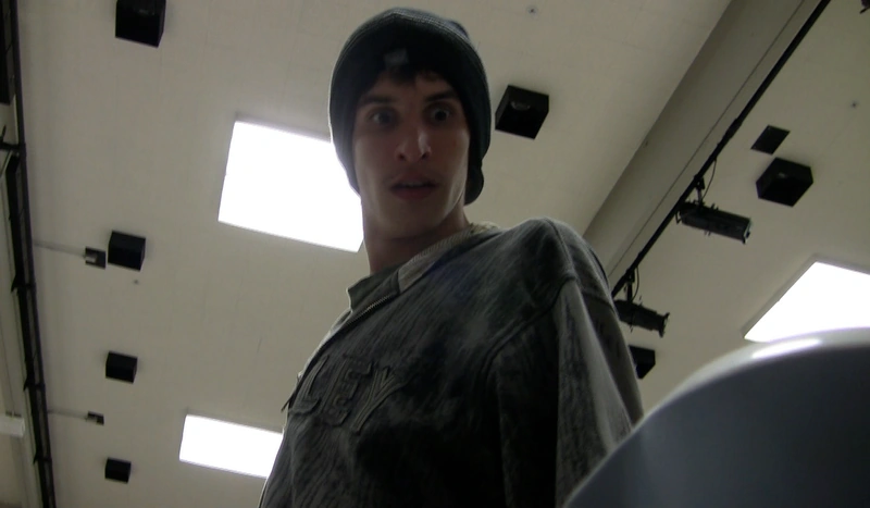 Filipe returns to the front of the room to lead the exercises. Lyle walks in. He's slightly disgusted. He walks to Teddy's body and hovers around him, not sure how to proceeded. Then he grabs Teddy by the legs and drags him awkwardly out the door.